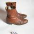 Description : Chaussure à tige montante de couleur marron avec une piqûre fantaisie le long de la tige pour tenir la partie supérieure entourant la jambe. Fermeture "éclair" sur toute la hauteur à l'intérieur de la jambe. Doublure intérieure en jean de teinte claire. Semelle en caoutchouc dur rainurée, collée. Le talon est en caoutchouc lisse collé et cloué.