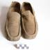 Description : Chaussures basses imitant le daim de couleur marron clair. Présence d'une grosse piqûre de liaison entre le dessus du pied et le bord. Présence d'une patte de garniture sur le dessus. Elle est ajourée. Renfort de la partie arrière du talon. Semelle en caoutchouc dur. La semelle et le talon sont monobloc. Le pourtour de la chaussure est renforcé par une languette de toile plastifiée cousue.