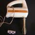 Description : Batteur corps en matière plastique avec poignée solidaire et de même moule permettant de tenir l'appareil d'une main au-dessus d'un bol. Sur la poignée se trouve un bouton poussoir à deux vitesses. Un seconde bouton permet de déverrouiller les fouets après usage. Sous la base de l'objet deux trous permettent d'introduire une paire de fouets (paire pour les crèmes, paire pour les blancs en neige). Un fil électrique gainée en matière plastique de 110 cm.