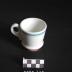 Description : Récipient individuel sur plan circulaire, à bords moyens et droits allant en s'évasant. La partie basse est soulignée par un renflement important. Présence d'une anse latérale verticale. Le récipient est décoré d'un liseré rouge sur le renflement de la base, puis bleu soutenu encadré de bleu claire, d'un filet rouge et d'un filet doré dans la partie supérieure. Présence d'un large liseré doré sur l'anse. Absence du tampon du fabricant.