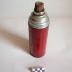 Description : Bouteille en verre très mince à double parois entre lesquelles on a fait le vide. Entourée d'un cylindre cannelé en métal laqué vert. La bouteille est fermée par un bouchon de liège. Une timbale était vissée dessus.