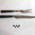 2001.005.2 Le couteau, manche et virole identiques à celui de la fourchette (13 cm). La lame très pointue (19 x 3 cm) est légèrement incurvée sur le côté tranchant, le côté opposé est légèrement élargi à la base sur 4,5 cm pour permettre la pression du doigt sans se blesser.