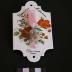 Description : Objet émaillé blanc avec un motif floral. Plaque rectangulaire dans laquelle ont été découpés les angles pour donner une forme fantaisie. Deux trous de fixation au centre des largeurs. Au centre de la plaque, un tube en verre (longueur 7, 5 cm - diamètre 1,5 cm) étranglé en son milieu pour former deux compartiments est fixé de façon à pouvoir pivoter de bas en haut et vice-versa.
