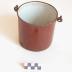 Description : Récipient sur plan circulaire à bord haut et droit, marron à l'extérieur et blanc à l'intérieur. Deux anneaux diamétralement opposés au sommet servent de points d'attache à une anse en fer pivotante.