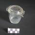 Description : 2001_016-1: récipient sur plan circulaire en pyrex parois épaisses, bords moyens galbés. Sur le bord supérieur : deux excroissances horizontales servent de poignée. Sur le fond : trois petits pieds en verre coulés dans la masse.