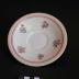 Description : Ensemble de cinq soucoupes. Récipient en faïence sur plan circulaire à bords bas. Face inférieure galbée et renfort circulaire pour servir de base (diamètre 7 cm). Face supérieure décorée : un liseré rouge et un liseré doré font le tour, cinq décors floraux, chaque petit bouquet multicolore est différent.