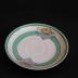 Description : Récipient en faïence sur plan circulaire à bords bas relevés. Face inférieure un renfort circulaire pour servir de base (diamètre 8,5 cm). Face supérieure décorée : un liseré vert tout le long du bord, le liseré est souligné par un chaînage noir, un anneau vert encadré de deux lignes noires, deux bouquets floraux dont la base est constituée d'arabesques bleues.