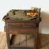 Description : Établi constitué d'une table carrée à quatre pieds et équipée de deux tiroirs. La table : planche à coin coupés avec un rebord, les quatre coins sont munis de planchettes afin de faire deux logements triangulaires par coins. Un tiroir muni d'une poignée constituée d'une lanière en cuir clouée à ses extrémités et en son centre. Un tiroir latéral divisé en deux parties (pas de poignées). Les quatre pieds sont reliés par un cadre latéral renforçant l'assise. L'établi est équipé d'une machine à poser les oeillets composée d'une base support en arc de cercle, vis à manivelle à relevage automatique ; l'oeillet est rivé entre l'embase et la tête marteau à pointeau.