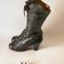 Description : Chaussures à talon haut de 6 cm, semelle cuir, bouts arrondis, claque entière, tige de 20 cm, 18 paires d'oeillets pour le laçage avec un lacet noir, deux systèmes de laçage : les cinq premiers horizontaux les autres croisés. Elles sont doublées à l'intérieur de chevreau beige et toile beige.
