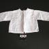 Description : Vêtement de bébé fait d'une seule pièce sur laquelle ont été montées des manches. Le vêtement est fendu à l'arrière et fermé en se croisant. Un lacet plat coulisse dans l'ourlet de l'encolure pour fixer le vêtement. Une dentelle blanche est cousue autour du col et des manches.