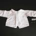 Description : Le corps du vêtement est fait d'une seule pièce avec une couture sur les épaules et sur laquelle sont montées les manches. Le vêtement est fendu dans le dos et se ferme en se croisant. Col Claudine festonné. Revers en forme de triangle et festonné aux manches. Un petit bouton recouvert de toile blanche et cousu sous le col et le vêtement est fermé par une ganse se fixant autour de ce bouton. Un ourlet sur le bas et des deux côtés de la fente.