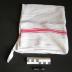 Parallèlement aux grands côtés : deux ensembles constitués d'une bande large (1,2 cm) encadrée de 2 bandes étroites (0,4 cm) de couleur rouge. Dans un des angles une ganse réalisée avec un lacet plat replié sur elle même (largeur du lacet plat 2 cm, longueur de la ganse 6 cm).