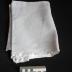Description : Pièce rectangulaire, les deux petits côtés sont terminés par un ourlet cousu à la machine. Parallèlement aux petits côtés une bande étroite (1 cm) sans dessin est prise dans l'ourlet, elle est suivie d'une bande large (1,5 cm), d'une étroite, une large et une étroite. Sur une des faces les lettres"FL" sont brodées en rouge au milieu de la largeur, un petit morceau de lacet plat avec les lettres "FG" brodées en rouge et à ras de l'ourlet un autre morceau de lacet plat porte également brodé en rouge le chiffre 78.