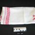 Description : Pièce de tissu rectangulaire ourlée sur les deux petits côtés, liserés sur les deux grands. Deux bandes rouges de 1 et 2,5 cm de large avec des motifs blancs font le tour de la serviette. Au centre sont brodés au point de croix avec du coton rouge mercerisé des initiales de 5 cm de hauteur : R. C. Tissage damassé. La serviette était pliée en 3 sur la longueur et 3 sur la largeur de façon à mettre en évidence les initiales, au moment de la mise du couvert la serviette était posée à plat dans l'assiette ; il existait aussi d'autres techniques de pliage plus sophistiquées qui agrémentaient l'aspect de la table.