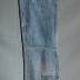 Description : Pantalon dont les jambes s'évasent vers le bas dit "pattes d'éléphant". Deux poches carrées plaquées sur l'arrière et deux semblables plaquées sur le devant (13x11 cm). Cinq passants pour la ceinture. Braguette fermée par une fermeture éclair et un bouton cuivré et sa boutonnière. Sur la poche arrière droite se trouve une petite plaque cuivrée (0,5 x 2 cm) porte la marque du pantalon. Tour de taille 62 cm. Ce pantalon présente une pièce remarquablement bien rapportée sur le fond usé, des reprises aux poches, une fine reprise sur une jambe, un ourlet de 8,5 cm grossièrement cousu.