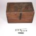 Description : 2002_073_1 : caissette en bois rectangulaire bords hauts droits, couvercle muni de 2 charnières réalisées avec 2 morceaux de cuir cloués sur la caissette et sur le couvercle, fermeture assurée par un morceau de cuir cloué sur le couvercle , il est fendu à l'autre extrémité pour permettre le passage d'un clou cavalier planté dans le couvercle.