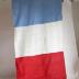 Description : Drapeau fait de 3 bandes rectangulaires de tissu de couleur bleue, blanche et rouge. Elles sont cousues avec du fil de couleur bleue, blanche et rouge. Le tissu de la bande blanche provient d'un rideau de fenêtre. La hampe (L : 153 cm) est une baguette en bois de section carrée (1,5x1,5 cm), elle est recouverte d'un fourreau de tissu bleu sur une hauteur de 72 cm. Le drapeau est cousu sur ce fourreau.
