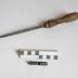 Petite lime à section triangulaire (L : 15 cm). Triangle de 0,8 cm de côté allant en s'amincissant vers la pointe. La soie est noyée dans un manche profilé en bois.