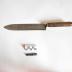 Description : Lame à double tranchant à bout pointu avec un manche dont la soie est perpendiculaire à la lame et pénètre dans un manche en bois reserrée par une virole en cuivre.