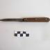 Description : Lame de 9,5 cm dont la soie dans pénètre dans un manche en bois dont la fente est maintenue fermée par trois rivets. Le bout du manche est arrondi.