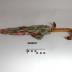 Description : Pan de tissu décagonal, quasi circulaire donc (D : 70 cm), tendu sur 10 baleines mobiles le long du manche (baleines en fer peint), présentant comme décoration : des roses roses, des fleurs jaunes, des grappes de cerises, sur fond général gris-bleu. Le manche, L de 35 cm, est en bambou avec des parties en fer (D : 1,4 cm). La crosse prolongeant ce manche (L : 16,5 cm D : 2,4 cm) est également en bambou, mais celui-là est gravé, d'un côté de motifs géométriques, de l'autre de fleurs, peintes ensuite. A l'autre extrémité du manche, dépassant du dessus de l'ombrelle, est fixé un cabochon de bois (L : 4 cm D : 2 cm).
