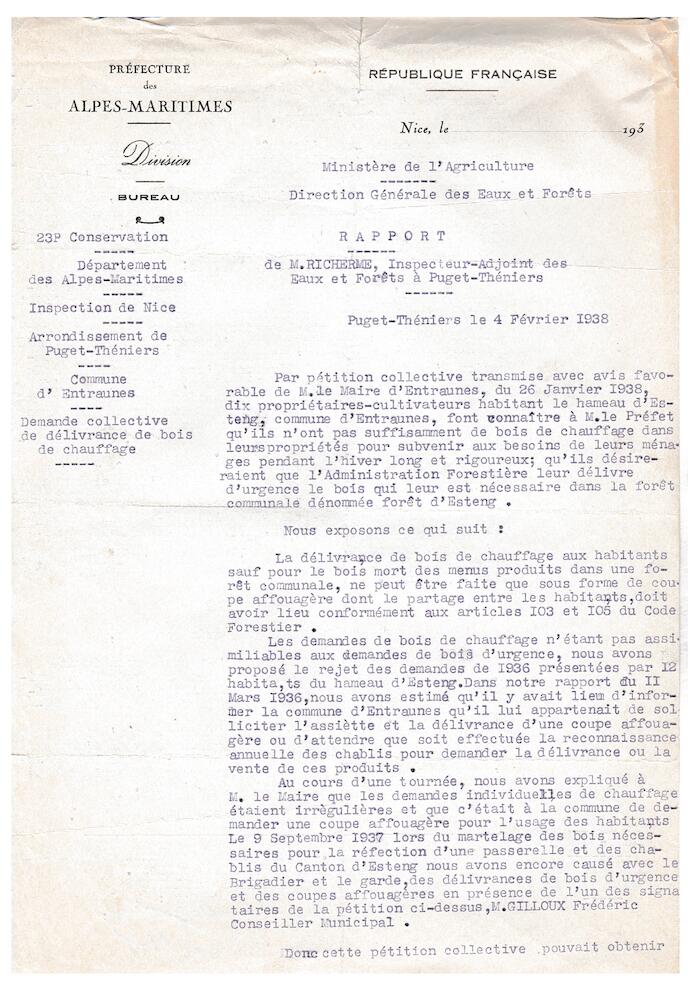 [Rapport de l'inspecteur des Eaux et Forêts suite à la pétition collective des habitants d'Estenc concernant le manque de bois de chauffage - 1938]