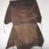 Sac en toile entièrement dépliable dont les bordures sont renforcées par une lanière de cuir. Il est muni de deux grandes poches intérieures à soufflet (57x45 cm). Fermées par un rabat maintenu par deux boutons et deux sangles en cuir percées de deux oeillets. A la base, une couture délimite deux longs passants dans lesquels devait passer une tige rigide. Deux rabats latéraux de chaque côté des poches se rejoignent à l’intérieur par des lacets qui peuvent se nouer entre eux. Les deux poches se rabattent l’une sur l’autre formant la sacoche de (61x53 cm). La sacoche est fermée par deux sangles coulissant chacune dans quatre passants. Une poignée centrale composée d’une sangle repliée et cousue sur elle même. Elle est fixée sur une tringle de bois passant dans l’ourlet supérieur du sac. Au deux extrémités de la tringle des clous à tête ronde de protection.