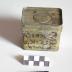 Description : Récipient composé de deux parties. La première partie est un récipient sur plan rectangulaire à bords droits (H : 6,2 cm en métal blanc). Les bords s'évasent légèrement. Dimensions de la base (7,6 x 5 cm) dimension de l'ouverture ; 7,8 x 5,9 cm. Inscriptions en noir sur une face (illisible).
